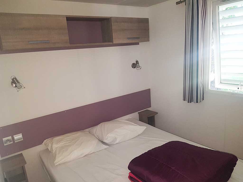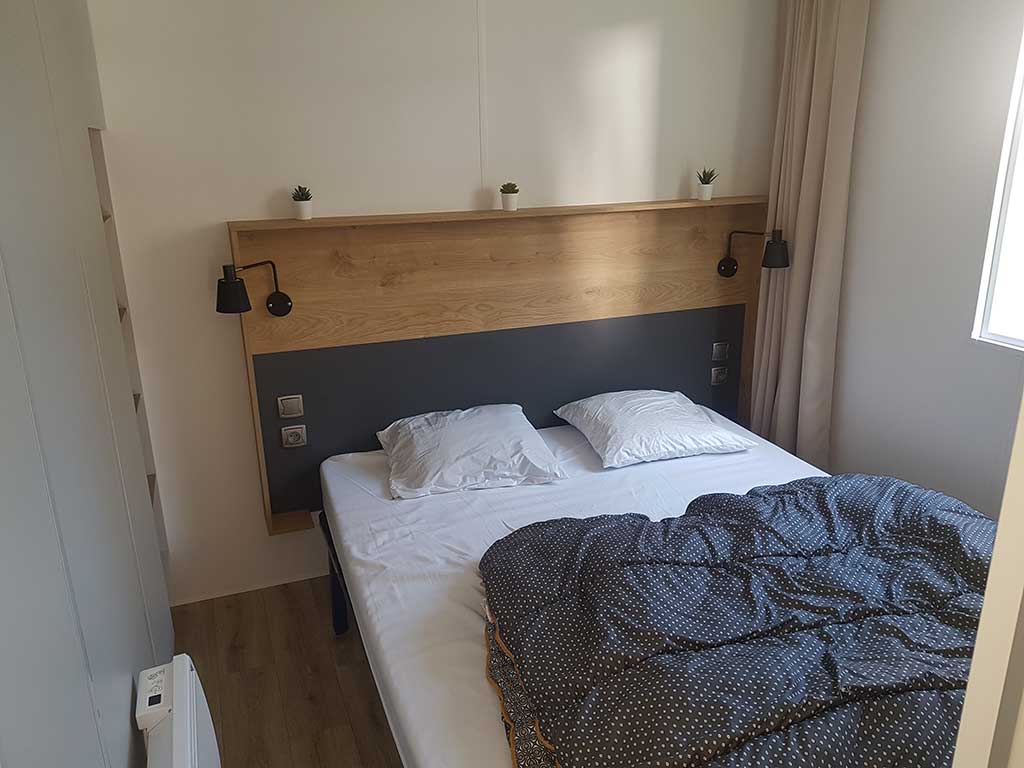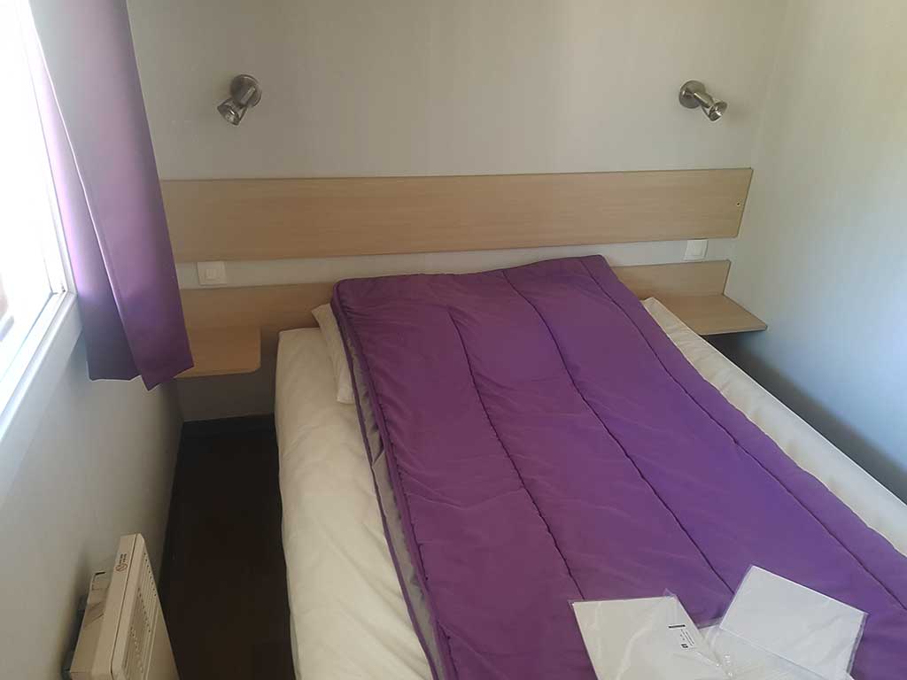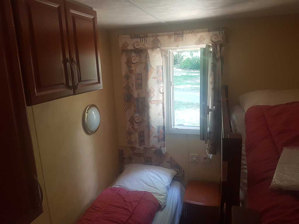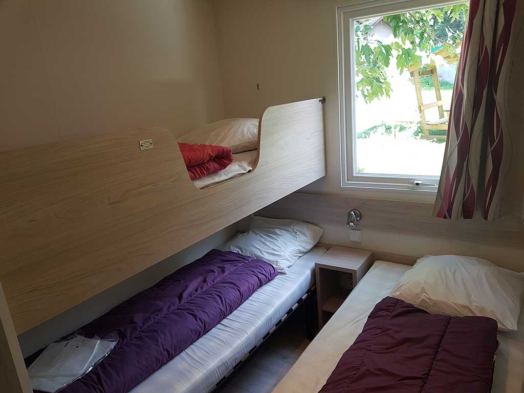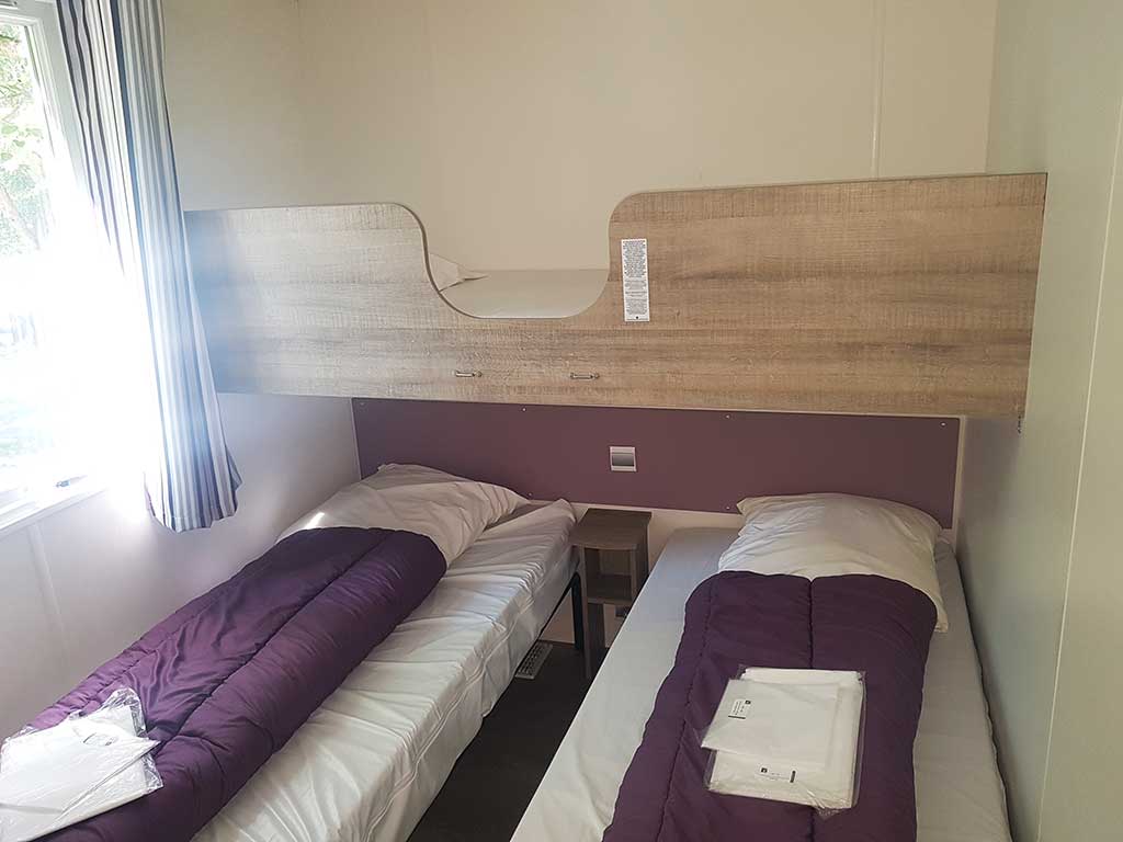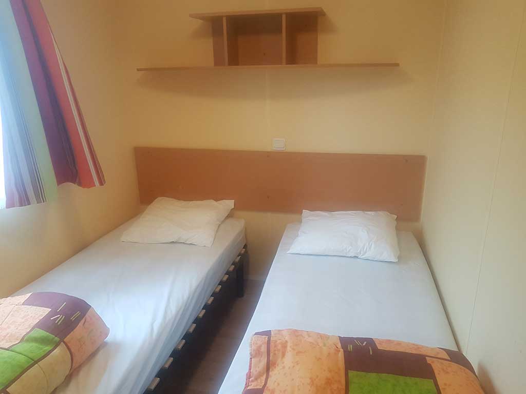 Chaque mobil-home est composé de deux chambres dont une avec un grand lit en 140 et l'autre avec trois lits simples de 80.