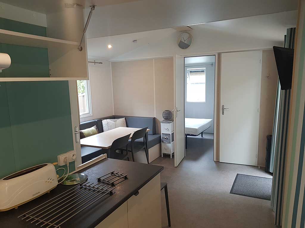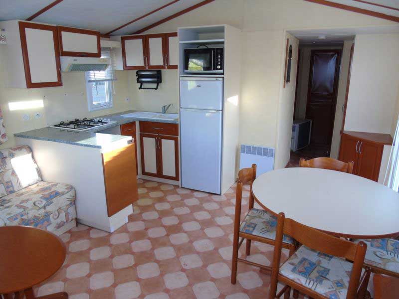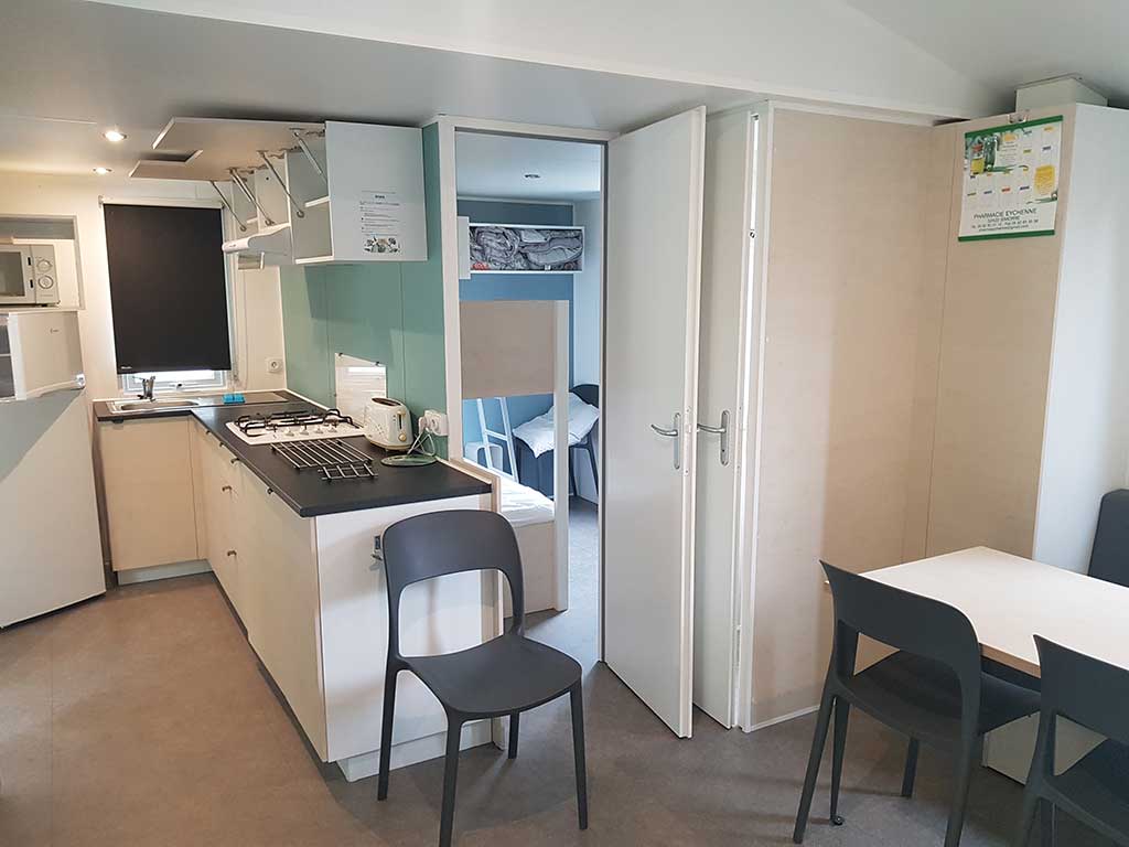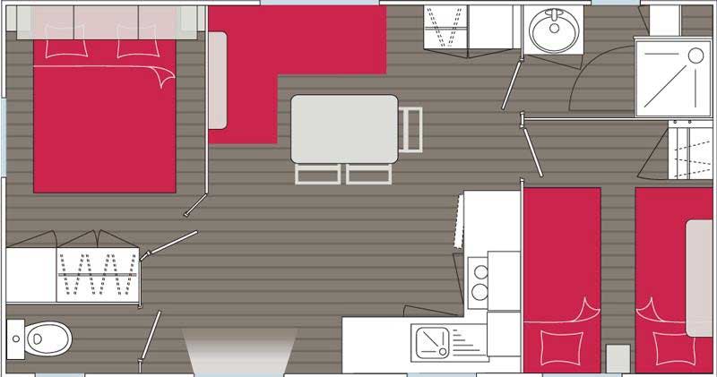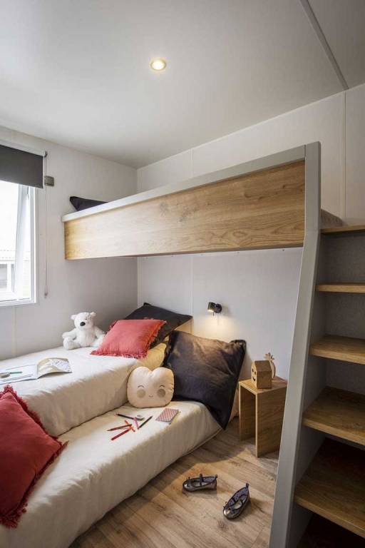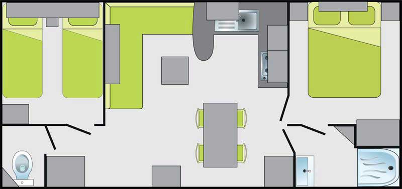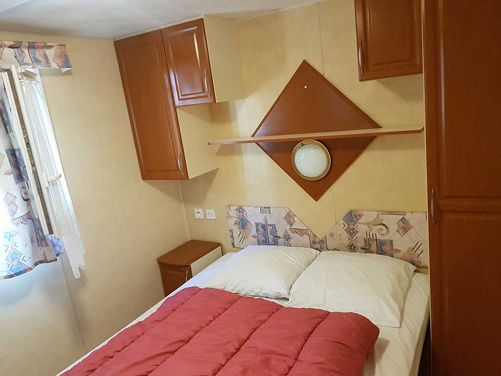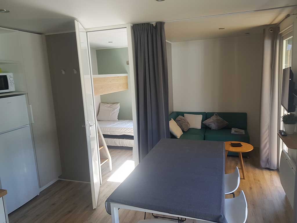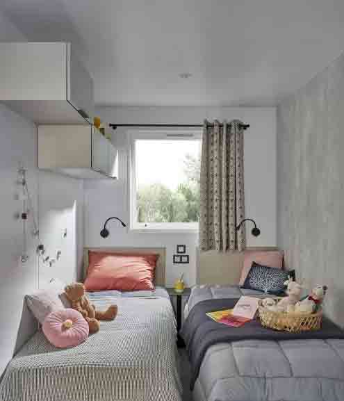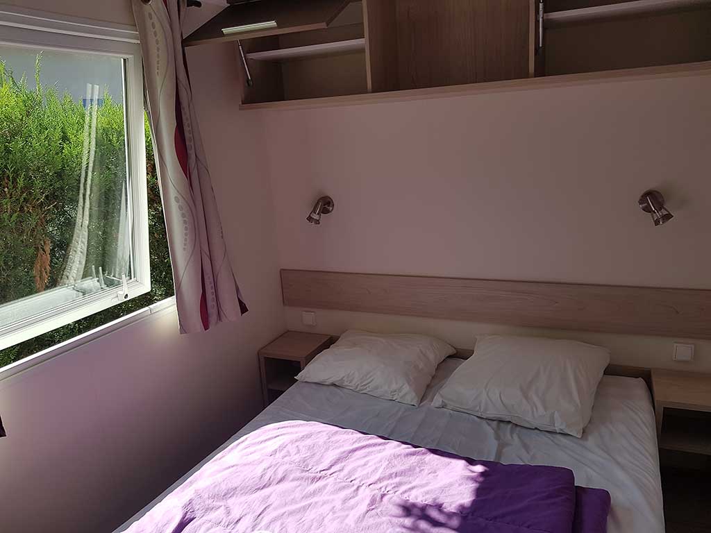 Chaque mobil-home est composé de deux chambres dont une avec un grand lit en 140 et l'autre avec trois lits simples de 80.