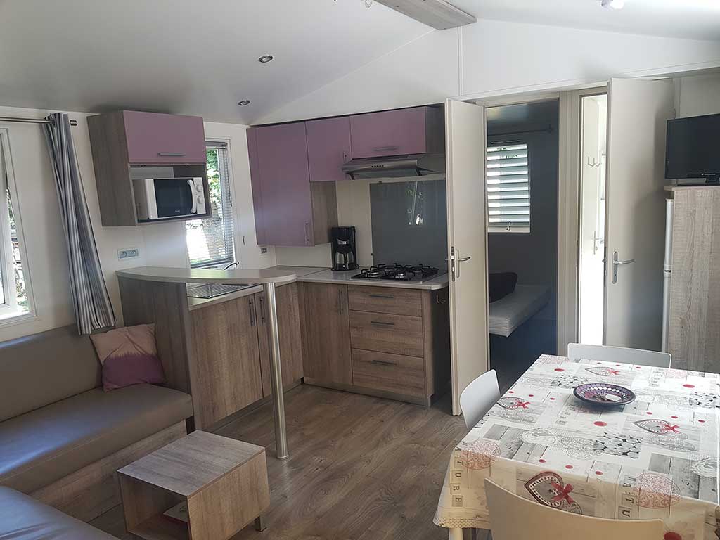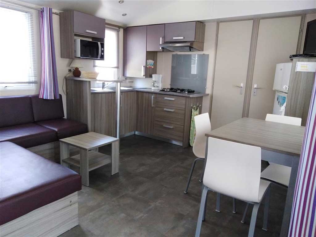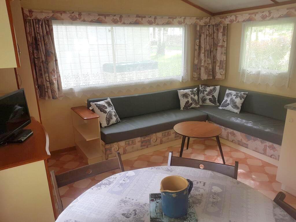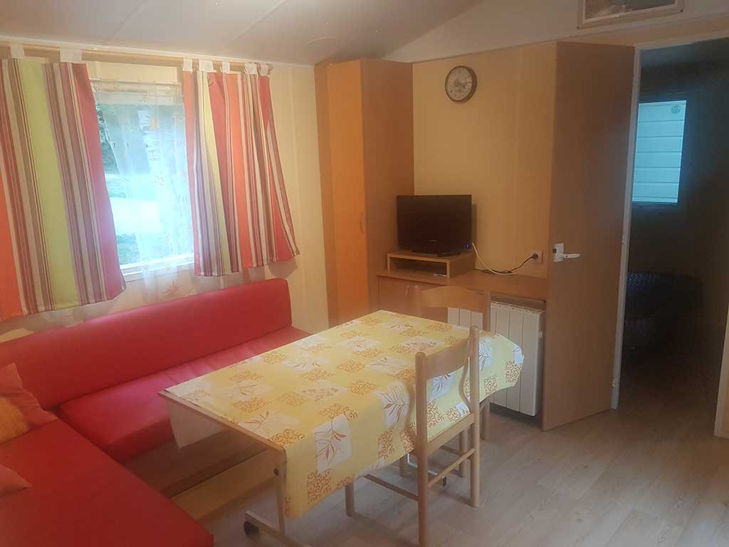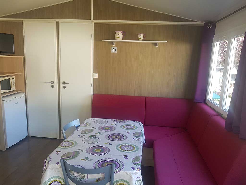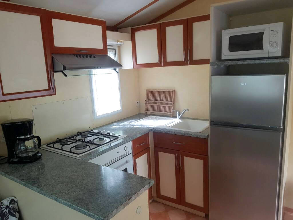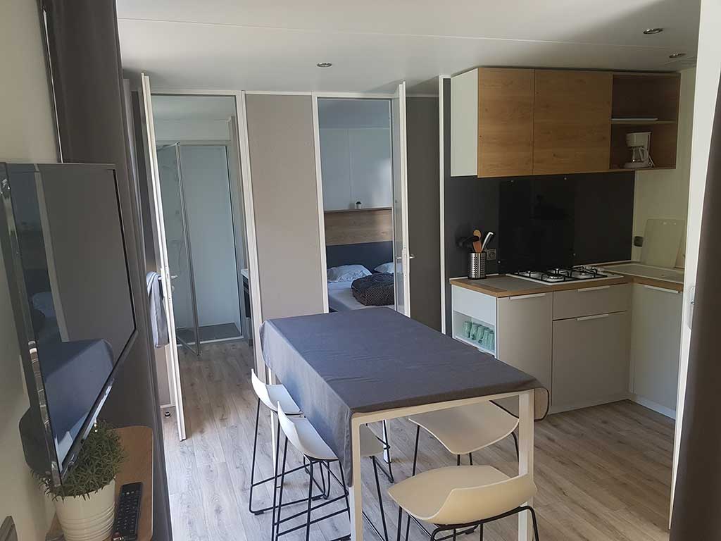 Chaque mobil-home est composé de deux chambres dont une avec un grand lit en 140 et l'autre avec trois lits simples de 80.