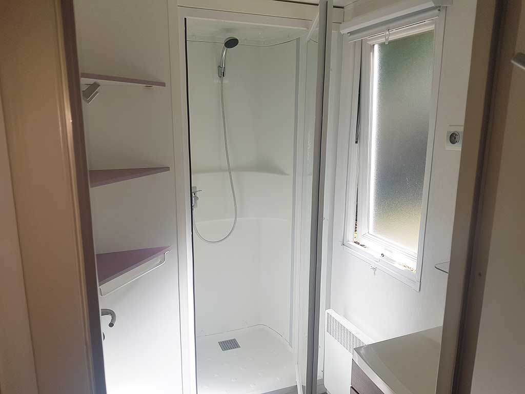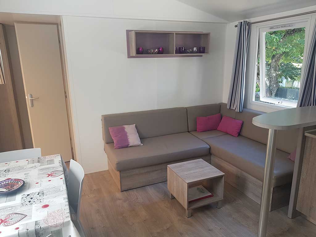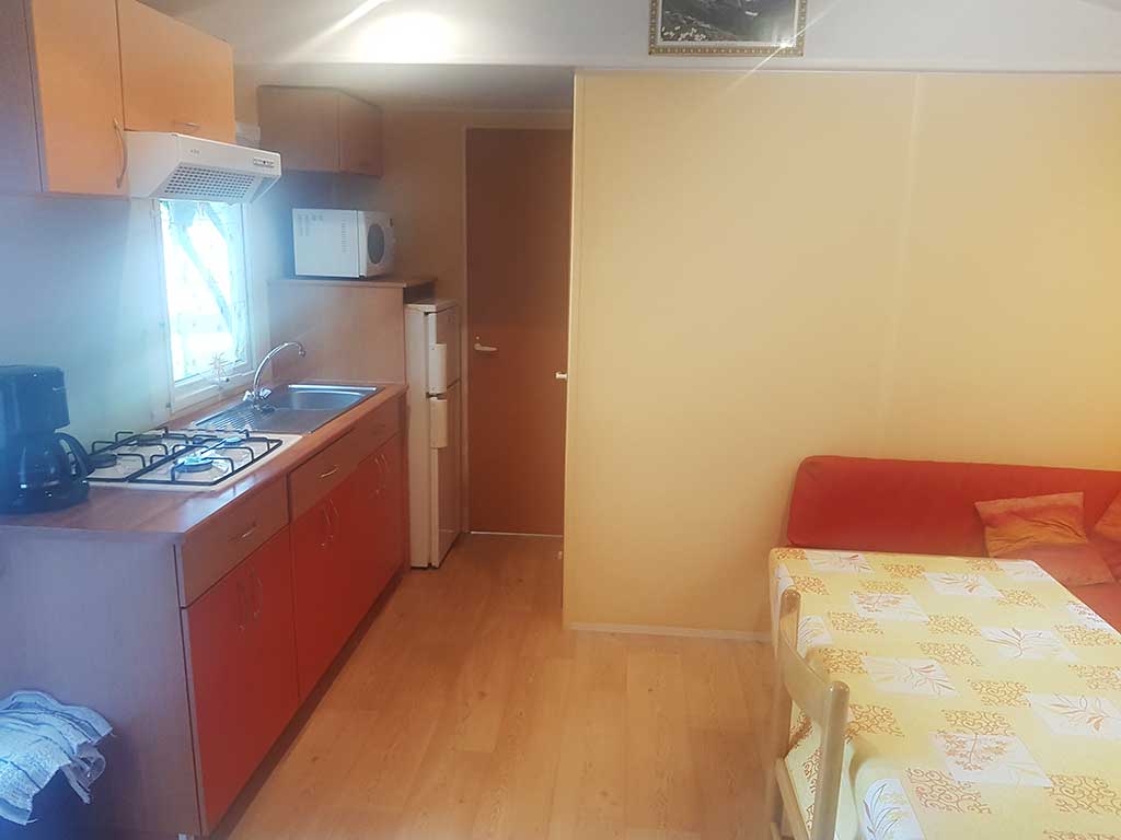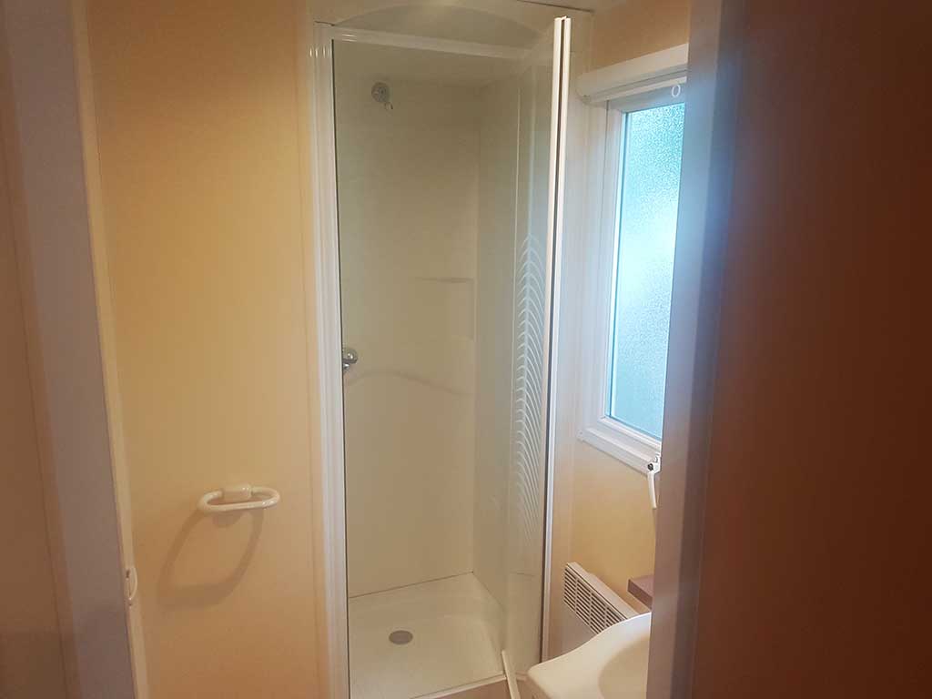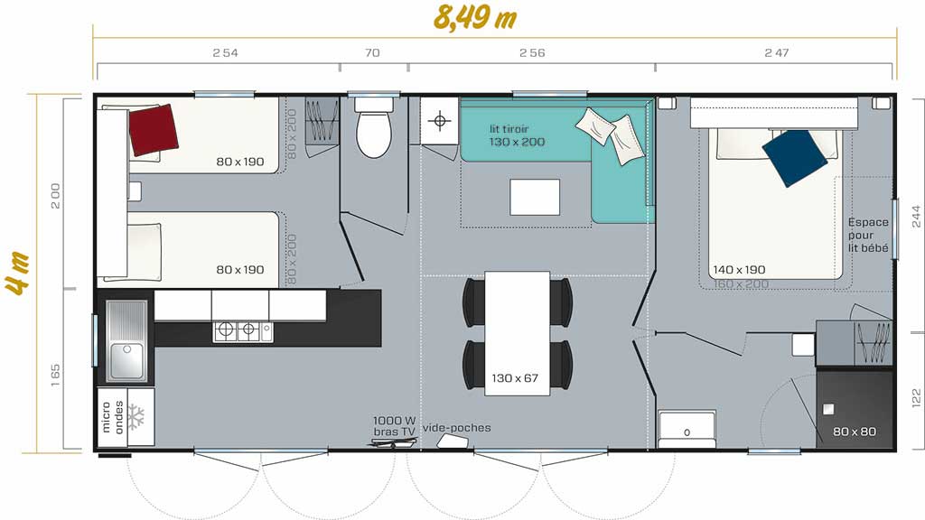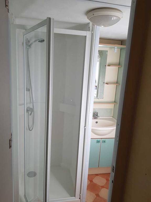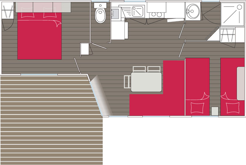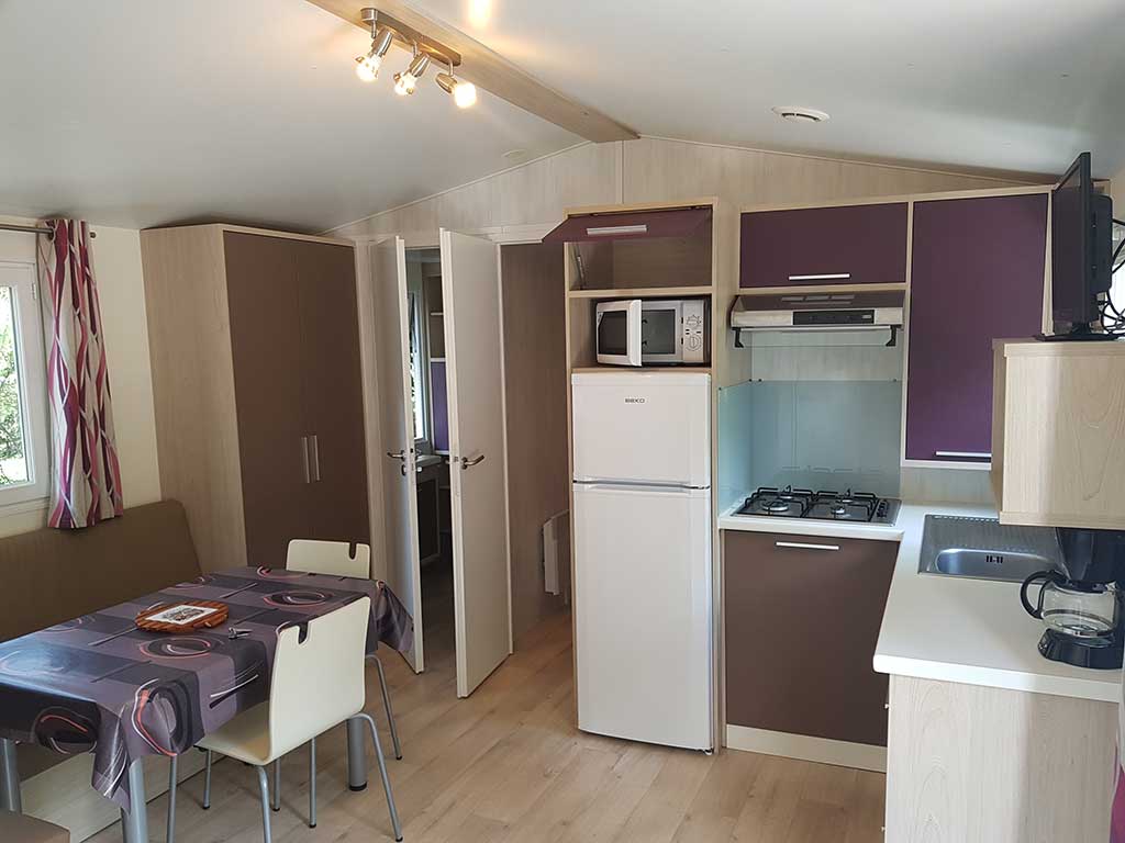 Chaque mobil-home est composé de deux chambres dont une avec un grand lit en 140 et l'autre avec trois lits simples de 80.